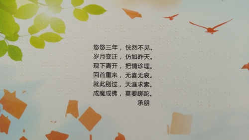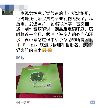 感謝所有為“盲文畢業(yè)紀(jì)念冊(cè)”做出奉獻(xiàn)的人,因?yàn)槟銈?,世界更美麗。掃描封面二維碼,聆聽2018屆貳家畢業(yè)班同學(xué)的校園故事,不知不覺,熱淚盈眶,感動(dòng)之余,我明白了“讓印刷走進(jìn)千家萬戶,為幸福生活添色加彩”的真實(shí)含義。